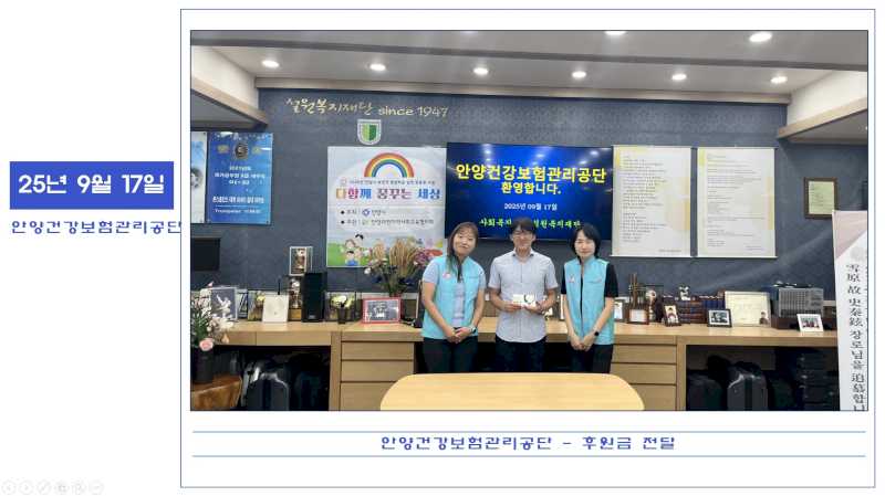 25년 9월 17일 안양건강보험관리공단 후원금 전달 페이지 정보 작성자 운영자 댓글 0건 조회 131회 작성일 26-01-31 11:00 본문 안양건강보험관리공단에서 방문하셔서 후원금을 전달해 주셨습니다. 감사합니다. 목록 이전글25년 9월 18일 안양우편집중국 후원품 전달 26.01.31 다음글25년 9월 16일 안양시청 공직자부인회 후원품 전달 26.01.31 댓글목록 댓글목록 등록된 댓글이 없습니다.