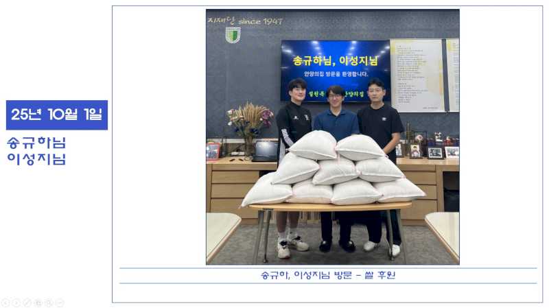 25년 10월 1일 송규하, 이성지님 후원품 전달 페이지 정보 작성자 운영자 댓글 0건 조회 154회 작성일 26-01-31 12:15 본문 송규하, 이성지님께서 방문하여 쌀을 후원해 주셨습니다. 감사합니다. 목록 이전글25년 10월 1일 시민정원사 정원 조경봉사 26.01.31 다음글25년 9월 29일 안양과천교육지원청 후원금 전달, 9월 일정공지 26.01.31 댓글목록 댓글목록 등록된 댓글이 없습니다.