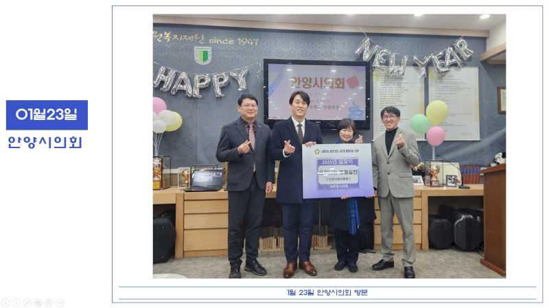 2025년 1월 23일 안양시의회 후원방문 페이지 정보 작성자 운영자 댓글 0건 조회 999회 작성일 25-01-29 13:50 본문 안양시의회에서 후원방문 해주셨습니다. 목록 이전글2025년 1월 20일 안양과천교육지원청 후원방문, 1월 일정 공지 25.01.29 다음글2025년 1월 22일 지디씨주식회사 후원방문 25.01.29 댓글목록 댓글목록 등록된 댓글이 없습니다.