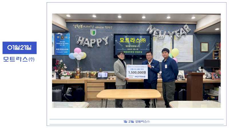 2025년 1월 21일 모트라스(주)에서 후원방문 페이지 정보 작성자 운영자 댓글 0건 조회 861회 작성일 25-01-29 13:48 본문 모트라스(주)에서 후원방문 해주셨습니다. 목록 이전글2025년 1월 21일 법무부 후원방문 25.01.29 다음글2025년 1월 21일 국립현대미술관 후원방문 25.01.29 댓글목록 댓글목록 등록된 댓글이 없습니다.