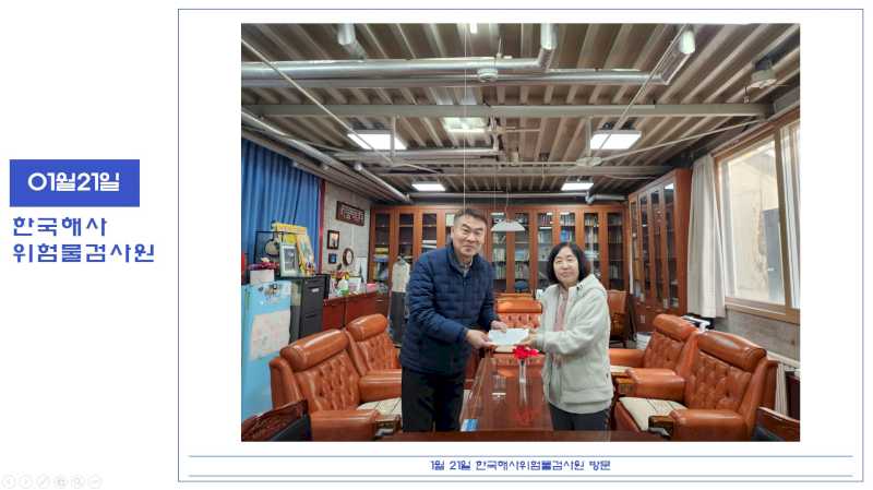 2025년 1월 21일 한국해사위험물검사원 후원방문 페이지 정보 작성자 운영자 댓글 0건 조회 991회 작성일 25-01-29 13:49 본문 한국해사위험물검사원에서 후원방문 해주셨습니다. 목록 이전글2025년 1월 22일 지디씨주식회사 후원방문 25.01.29 다음글2025년 1월 21일 법무부 후원방문 25.01.29 댓글목록 댓글목록 등록된 댓글이 없습니다.