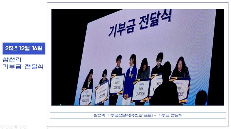 25년 12월 16일 삼천리 기부금 전달식(유현조 프로) 페이지 정보 작성자 운영자 댓글 0건 조회 222회 작성일 26-02-02 16:54 본문 삼천리 스포츠단 유현조 프로님께서 안양의집에 기부금을 전달해 주셨습니다. 감사합니다. 목록 이전글25년 12월 16일 티랩 후원금 전달 26.02.10 다음글25년 12월 12일 펄어비스 김대일문화재단 - 정장 지원사업 전달식 26.02.02 댓글목록 댓글목록 등록된 댓글이 없습니다.