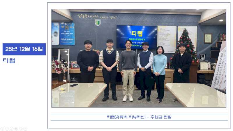 25년 12월 16일 티랩 후원금 전달 페이지 정보 작성자 운영자 댓글 0건 조회 150회 작성일 26-02-10 11:40 본문 티랩(유튜버 리뷰머신)에서 후원금 전달을 해주셨습니다. 감사합니다. 목록 이전글25년 12월 18일 삼천리성탄행사 26.02.10 다음글25년 12월 16일 삼천리 기부금 전달식(유현조 프로) 26.02.02 댓글목록 댓글목록 등록된 댓글이 없습니다.